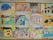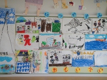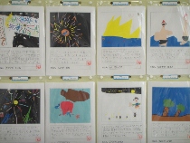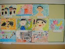 図工の時間に、夏の思い出を絵にしました。真ん中に思い出を大きく描いた後、背景をやさしい色で塗りました。