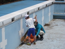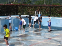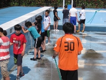 4年5年6年によるプール掃除が行われました。とても暑い、もうすでに真夏日に一生懸命大好きなプールをみがいてくれました。おかげさまでで、水色の床が太陽でまぶしいくらいに輝きました。早く水を入れて泳ぎたい気持ちになりました。
