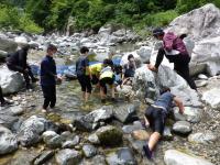 今日は、5年生の集合学習で河内小学校・白嶺小学校・白峰小学校と4校で白山ろく少年自然の家でイワナつかみをしました。