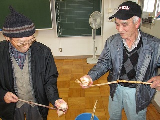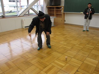 ビシごま(手作り)の先生が来校し、遊びを教えるための