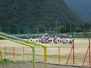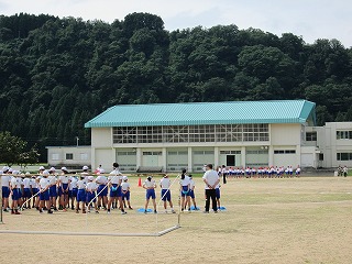 紅白に分かれ、校歌の練習合戦をしました。