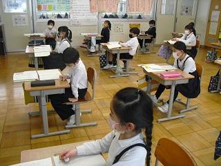 4年生の社会と算数。社会は一年間のまとめのテストの直しをしていました。算数は立方体や直方体の面や辺、頂点について調べていました。