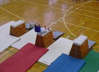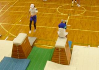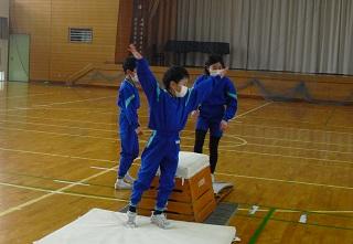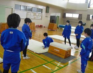 3年生の体育。跳び箱で台上前転の練習をしていました。