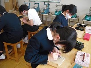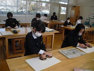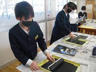 4年生の図工。版画の刷り方を習った後、実際に刷る作業をしていました。