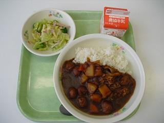 今日の給食は、ミートボールライスとサラダでした。ミートボールライスのルウはコクがあり、とてもおいしかったです。サラダのブロッコリーも新鮮で甘みもあって、とてもおいしかったです。