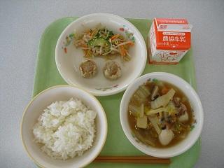 今日の給食は、しゅうまい、中華和え、八宝菜でした。八宝菜には野菜や魚介類がたくさん入っていて、とてもおいしかったです。