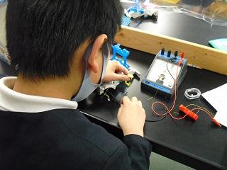 5年生の理科。電流の大きさが変わると電磁石の強さはどうなるのかを調べていました。コイルにくぎが引きつけられています。
