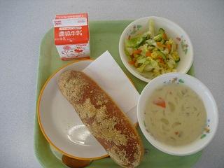 今日の給食は、きなこ揚げパン、コールスローサラダ、クリームシチューでした。揚げパンは、調理員さんが一つ一つていねいに給食室で油で揚げて、きなこと砂糖をまぶしています。心のこもった揚げパン、とてもおいしかったです。