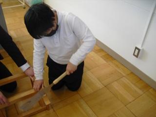 3年生の図工。上手に木をのこぎりで切ってそれを組み立てていました。