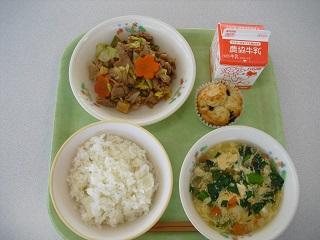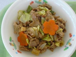 今日の給食はホイコーロー、たまごスープ、チョコバナナケーキでした。6年生が考えたメニューのひとつ、ホイコーローが登場しました。メニューにあったように調理員さんが人参を飾り切りにしてくれました。彩りもよく、とてもおいしかったです。ありがとうございました。