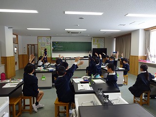 自分の考えを発表する場面で、挙手がたくさん見られました。