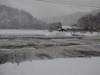 朝、学校に来ると、融雪用の用水が詰まり、水が
