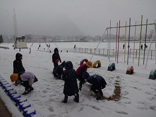 運動場も山々も雪一面。早速、子ども達は、雪遊びでした。