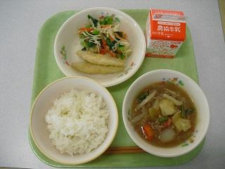 今日の給食は、わかさぎのフリッター、はりはり漬け、じゃがいものそぼろ煮でした。わかさぎは、川や湖に 住んでいる小さな魚で、大きいものでも10cmくらいしかありません。冬が旬の魚で氷がはった湖に丸い穴をあけて釣りをする穴釣りは冬の風物詩です。骨まで食べることができるので、カルシウムをたっぷりとることができます。カラッと揚がっていて、とてもおいしかったです。