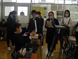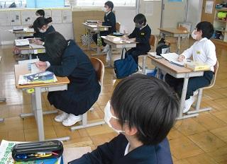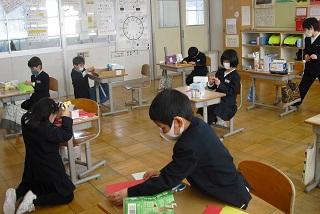 5年生が4年生に、たて割りお別れ会について説明しているところです。