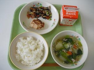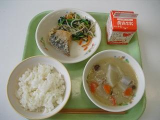 今日の給食は、さばの竜田揚げ、ほうれん草のごま和え、かす汁でした。酒かすの入ったかす汁です。酒かすです。酒かすはお米を発酵させてつくる日本酒をつくる時にできます。食べると体があたたまるので冬にぴったりの食材です。とてもおいしかったです。
