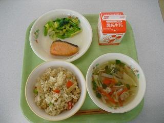 今日の給食は、中華おこわ、バンバンジーサラダ、たまごとわかめのスープ、リンゴゼリーでした。中華おこわは、普段食べているうるち米ともち米を合わせて中華の具を混ぜて炊いてあります。モチモチしていてとてもおいしかったです。