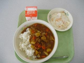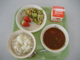 今日の給食は、ポークカレー、フルーツヨーグルトでした。今日もおいしくいただきました。