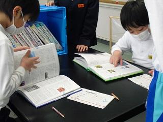 昼休みに図書委員会の取組で、百科事典の早引き大会をしました。4~6年生から代表2名が参加しました。