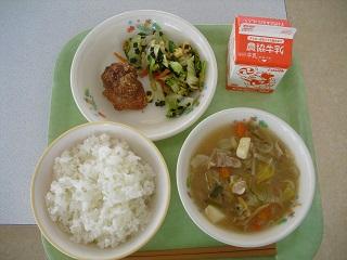 今日の給食は、鶏肉の塩こうじ焼き、れんこんきんぴら、すいとん汁でした。すいとんの歴史は古く室町時代の本にもでてくるそうです。小麦粉に水を加えて団子し、汁に入れて食べられます。今日は、もちもち感を出すために白玉粉を使っています。また、水のかわりに豆腐を使っています。たくさんの野菜も入って栄養たっぷりのすいとん汁、とてもおいしかったです。