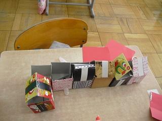 1年生の図工。箱を組み合わせて、家や動物などを作っていました。