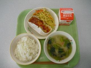 今日の給食は魚のピザ焼き、スパゲティーソテー、小松菜のみそ汁でした。魚のピザ焼きはトマトソースにチーズの味がきいていて、とてもおいしかったです。