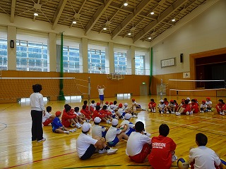 写真は、中学1年生とバレーボールの授業を