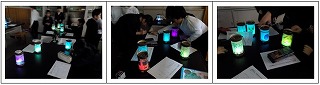図工で『ゆめいろらんぷ』という工作をしました。半透明の台紙に黒いマジックで絵を描いたり4色の透明シールを切って貼ったりしたものを組み立て、中に7色に輝くLEDライトを仕込みます。理科室の暗幕を引き点灯すると、一気に幻想的な雰囲気に。子どもたちは「きれい~」と歓声を上げながら自分や友達の作品に魅入り、一言感想を書いていました。