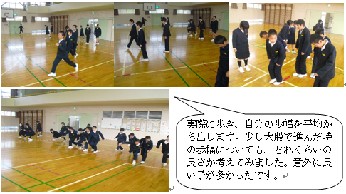 算数では、『平均』の学習をしています。10歩進んだ長さを3回測り、そこから1歩の歩幅の平均を出しました。これまで学習したことを生かして、歩幅を出すこともスムーズにできる子が多かったです。