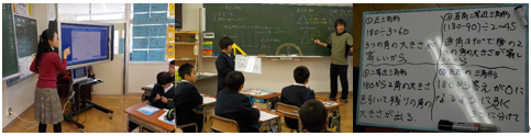 出村さんには、お忙しい中ご協力いただきました。本当にありがとうございました。 三角形の内角の和は何度になるか、そして、三角形の角の大きさを求めるにはどうすればよいか…ICTサポーターの長野先生のご協力をいただきながら、課題を解決していきました。映像を使って、分かりやすく学ぶことができましたね。
