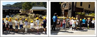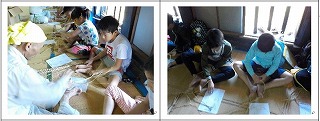 そのあと2グループに分かれて、一方は「わら細工(わらじを編む要領で「なべつかみ」作り)体験」。指導のお年寄りに教えてもらううちにコツをつかみ、友達に教える子も出てきました。