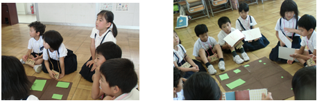 図書館司書の吉田先生から、『王様ライオンのケーキ』という本でアニマシオンをしてもらいました。アニマシオンというのは、本を読みながら、お話をよく聞いていないと、分からないゲームです。それぞれ登場人物のライオンやあり、ネズミ、カメ、カバなどになりきって演じていきました。今年のアニマシオンは、二年生の算数で学習する「4の2ばい」や「2分の1」などの言葉が盛りだくさんでした。