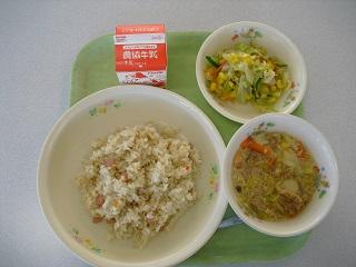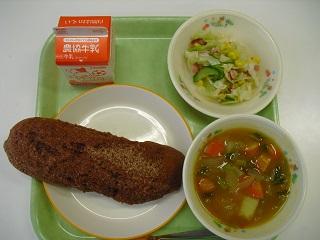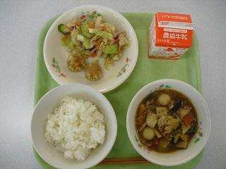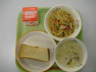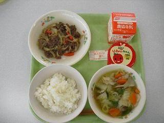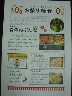 今日の給食は「お祭り給食」でした。青森ねぶた祭りにちなんで、青森県のメニューでした。十和田バラ焼き、せんべい汁、リンゴゼリーでした。バラ焼きは今から70年ほど前に青森県で誕生しました。牛バラ肉とたっぷりの玉ねぎをあめ色になるまでよく炒めて作ります。せんべい汁は、青森県八戸市の郷土料理です。しょうゆ味のスープに、季節の野菜やお肉、かやきせんべいを煮込んで作ります。せんべいに出汁がしみこんでいて、とてもおいしかったです。