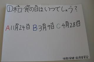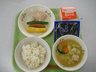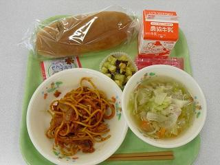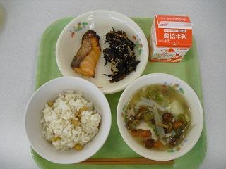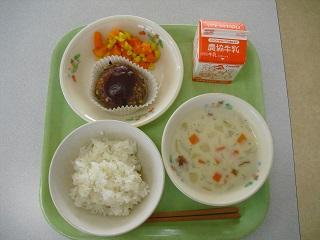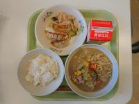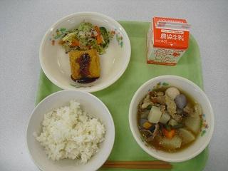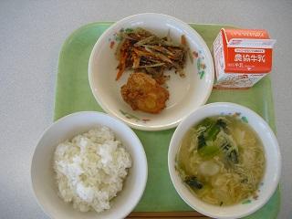 今日の給食は、鶏肉の竜田揚げ、きんぴらごぼう、豆腐と卵のみそ汁でした。みそ汁の中に入っていた「ふかし」もとてもおいしかったです。