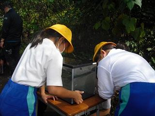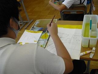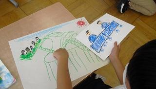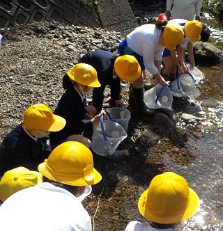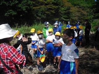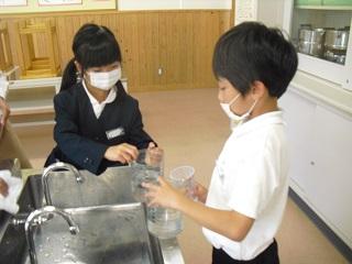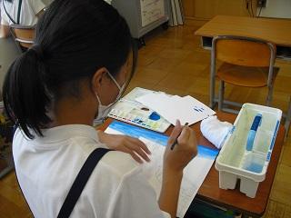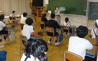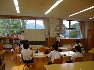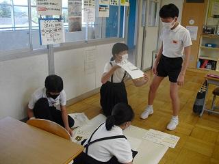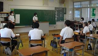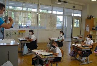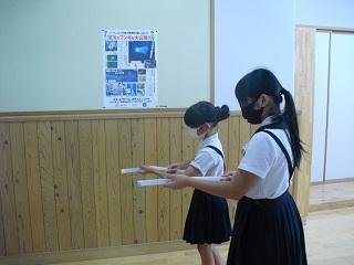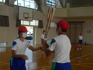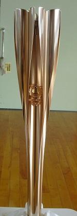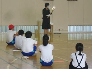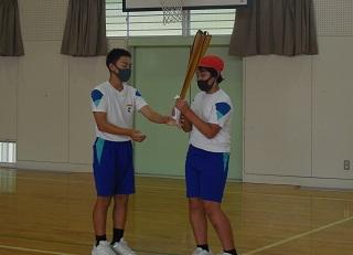 東京オリンピックの聖火リレートーチをお借りしました。ぶんぶんぼうるのまーしさんが母校の松任中学校に寄贈されたものです。まーしさんと松任中学校にお願いしてお借りすることができました。ありがとうございました。桜の花びらをかたどっていることや素材はアルミニウムで、被災地の仮設住宅で使用されていたアルミニウムが約30%再利用されていることなどを伝えました。実際に触れてみて、「思っていたよりも重い」「色もとてもきれい」などの感想を持っていました。