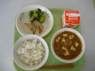 今日の給食のメニューは、ぎょうざ、きゅうりのピリ辛、マーボー豆腐でした。今日もおいしくいただきました。
