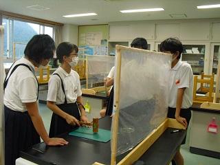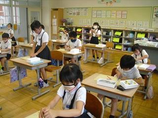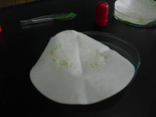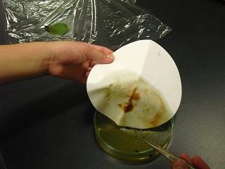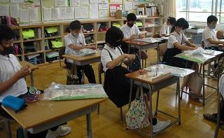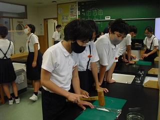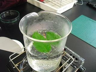 6年生の理科。植物はどのようにして栄養分を得ているのかを学習しています。日光を当てる前の葉、日光を当てる葉、日光を当てない葉について実験をしていました。葉を1~2分間煮たあと、ろ紙にはさみ、木づちでたたきます。その後、葉をはがしたろ紙をヨウ素液につけて反応をみます。