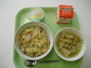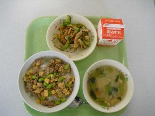 今日の給食は、三色丼、割り干し大根の中華漬物、みそ汁でした。丼は枝豆やたまごの彩りもきれいで、とてもおいしかったです。