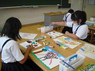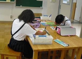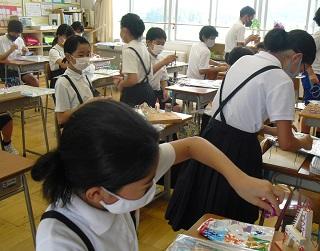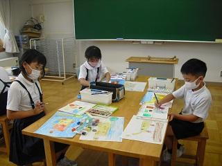 3年生の図工。「ふしぎなのりもの」を絵の具などで仕上げていました。身の回りのものや動物と乗り物を融合させたものを考えて描きます。
