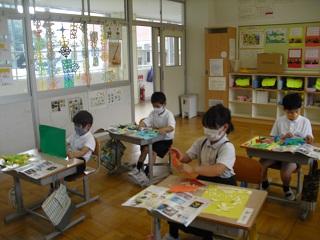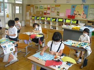 1年生の図工。色紙を好きな形にちぎって、貼って作品を仕上げていました。お菓子や木、家などを表現していました。
