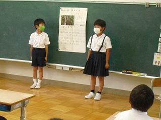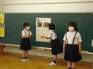 3年生は総合的な学習の時間に調べた、鳥越の自然や名所について1年生に伝えました。大きな声でジェスチャーも交えて堂々と発表できました。練習のときより上手になっていました。1年生も集中して聴いていました。そして、3年生へのお礼に「おおきなかぶ」の音読をしました。