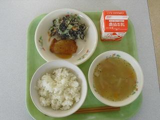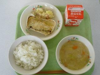 今日の給食は、魚のマヨネーズ焼き、ジャーマンポテト、キャベツのみそ汁でした。マヨネーズ焼きに使われていた魚は白身のホキで、マヨネーズでコクが加わりとてもおいしかったです。みそ汁もキャベツの甘みが出ていておいしかったです。