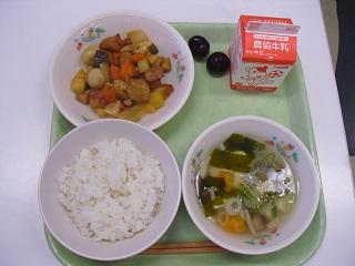 今日の給食。メニューは、豚肉の黒酢炒め、とうふとわかめのスープ、さくらんぼでした。おいしくいただきました。