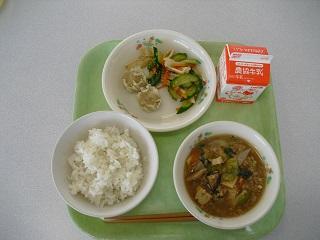 今日の給食は、しゅうまい、割り干しだいこんの中華漬物、家常豆腐でした。家常豆腐は、中華料理のひとつで、 中国の家庭でよく食べられる豆腐料理だそうです。 みそ味で、とてもおいしかったです。漬物も割り干し大根の歯ごたえがあって、とてもおいしかったです。