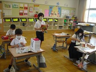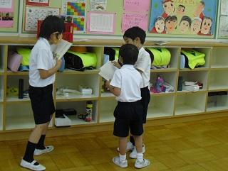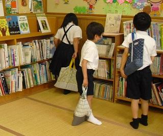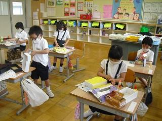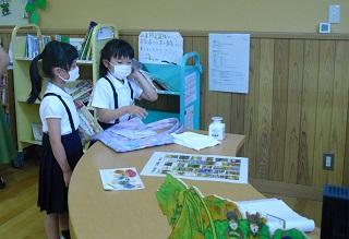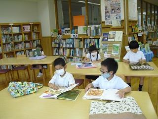 1年生は読書週間にあたって、図書館で本を借りていました。たくさん読んでくださいね。
