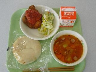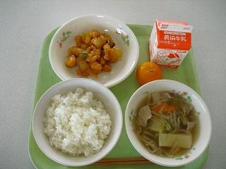 今日の給食は、鶏肉と大豆のチリソース、ワンタンスープ、冷凍みかんでした。ほどよい辛さのチリソース、野菜たっぷりのスープでした。今日もおいしかったです。