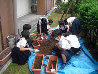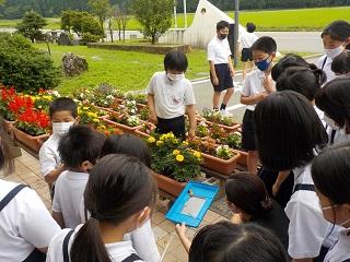 3年生は理科の授業で植えた種から成長したマリーゴールドやホウセンカなどの苗をプランターに植えていました。