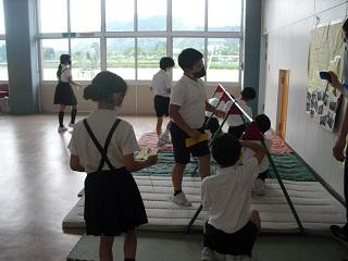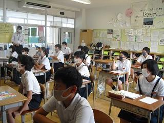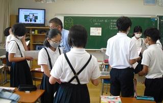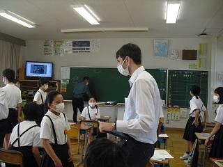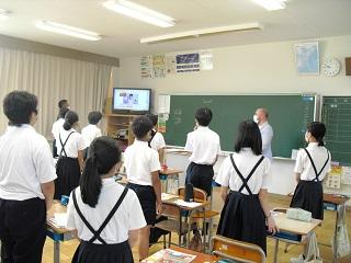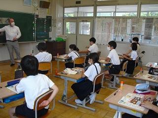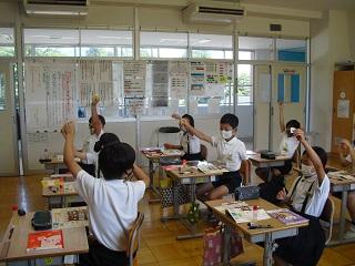 4年生の外国語活動。文房具の言い方について学習していました。ALTの先生が英語で言った文房具を聞き取って上にあげています。