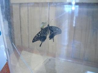 朝、学校にきたら、さなぎからアゲハチョウになっていました。はねの色がとてもきれいでした。