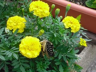 さなぎから成虫になっていたアゲハチョウ2匹を長休みに放しました。しばらくマリーゴールドの花にとまっていました。